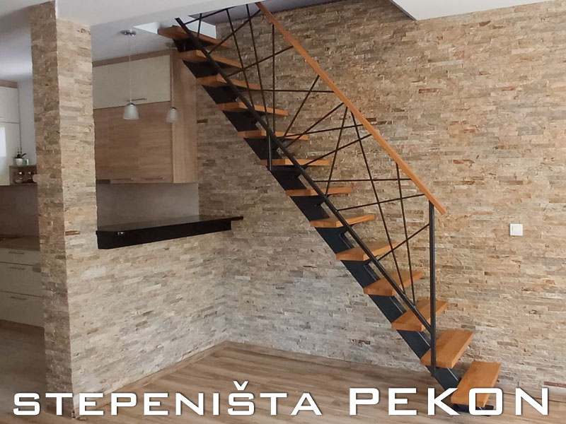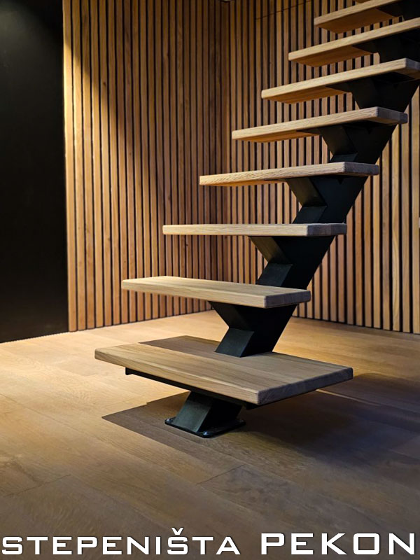Unutrašnje metalne stepenice sa centralnim nosačem u kombinaciji sa drvenim gazištima i rukohvatom ili ogradom. U zavisnosti od uslova prostora i zahteva kupca, stepenice mogu biti izvedene kao pravolinijske, ili u formi slova "Г" ili "П". Širina stepenica je do 80cm, a debljina gazišta 4cm. Gazišta i rukohvati mogu biti izrađeni od hrasta, bukve, oraha, jasena i drugih vrsta drveta. Ovaj model stepenica vizuelno proširuje prostor i daje osećaj prozračnosti u enterijeru. Deluju elegantno i moderno, što ih čini veoma traženim.